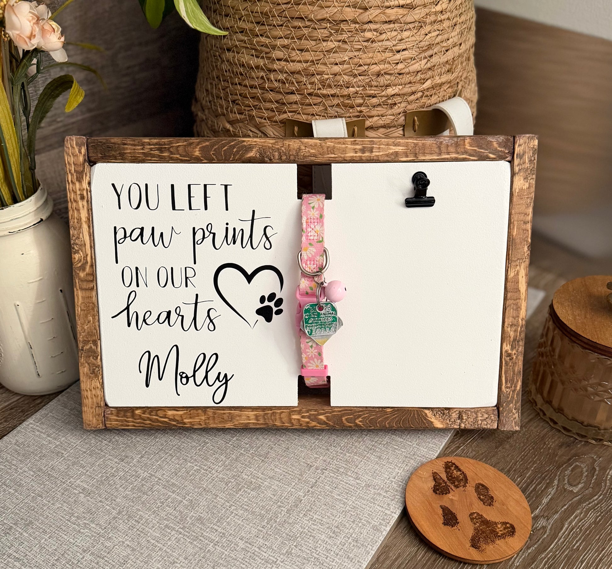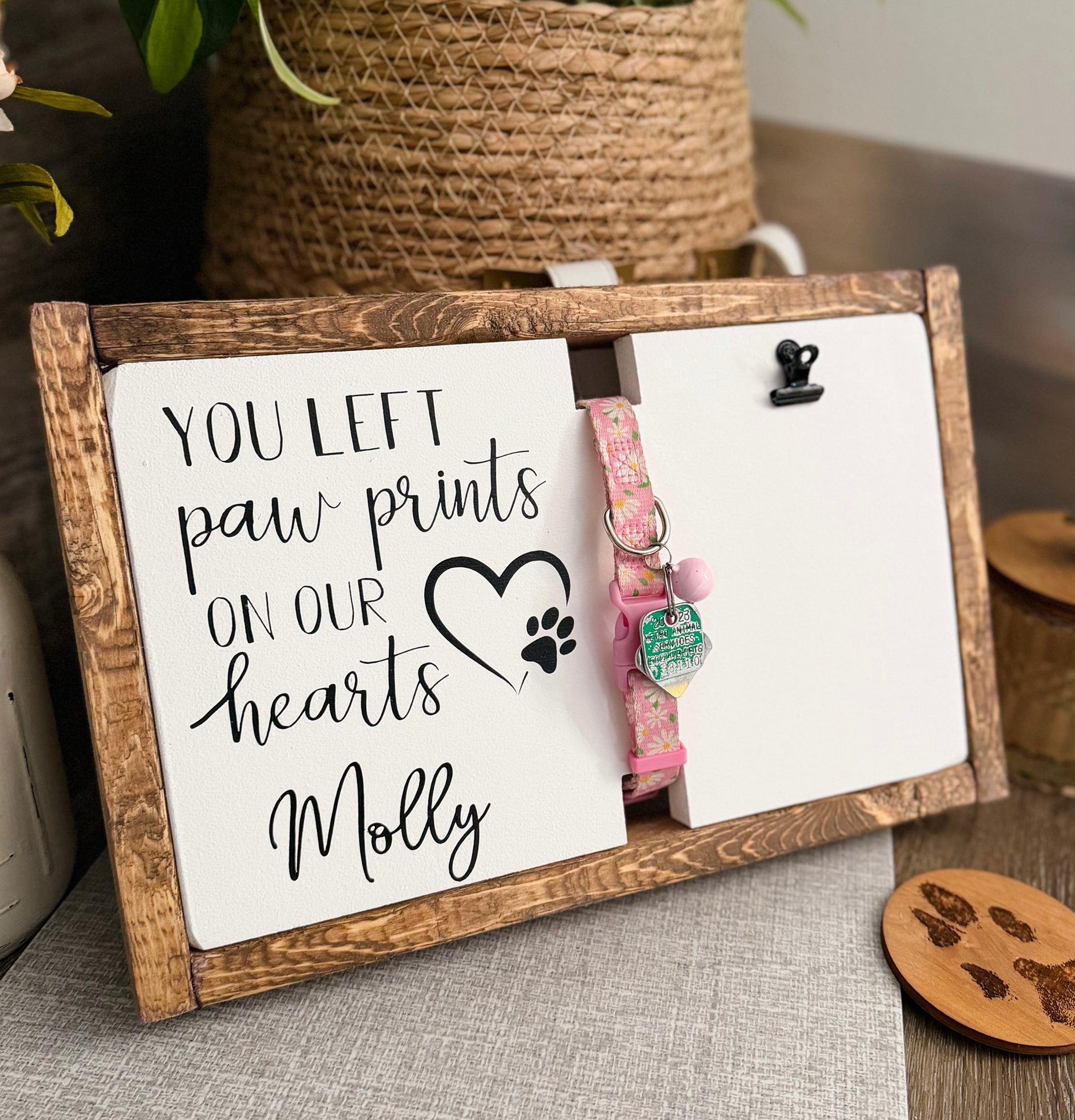 Celebrate the life of your beloved pet with our ‘You left paw prints on our hearts’ memorial sign. Thoughtfully designed with a wrap-around dog collar holder + a photo clip, this memorial keepsake is crafted to be both a comforting piece and a beautiful tribute to the special bond you and your heart dog (or cat) shared.